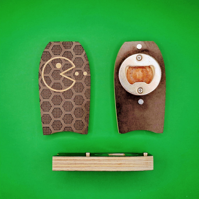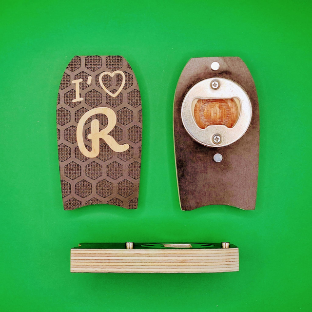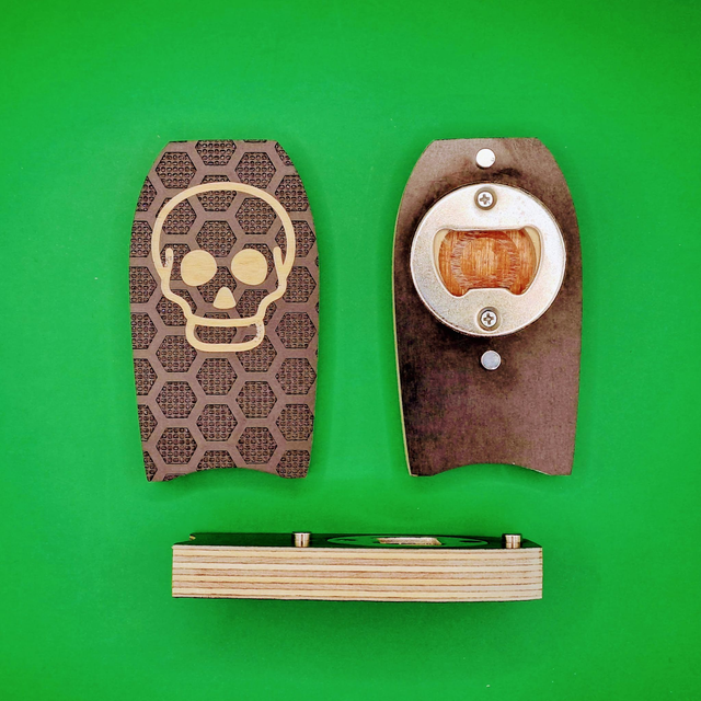 Ce décapsuleur est en forme de planche de BodyBoard pour rappeler la proximité de l'atelier avec l'océan, ce qui lui confère également une très bonne prise en main. Il est aimanté pour le laisser toujours à portée de main dans votre Van ou la porte du frigo.