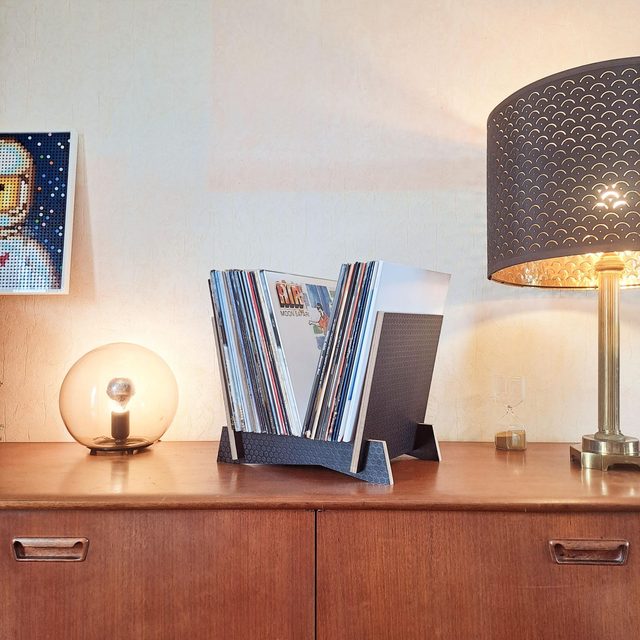 Support de rangement et présentoir à disques vinyles au format 33 tours créé et fabriqué artisanalement à partir de déchets industriels sourcés localement (Rochefort Océan).